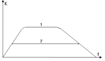 Рисунок 1.2- Графики частотной характеристики RC-каскада без обратной связи (1) и того же каскада после введения отрицательной обратной связи (2).
