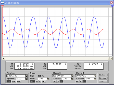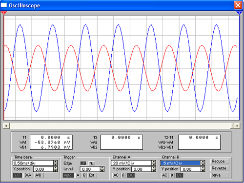 При отсутствии обратной связи на осциллограмме видно, что выходной сигнал значительно больше входного. Коэффициент усиления приблизительно равен К≈125.