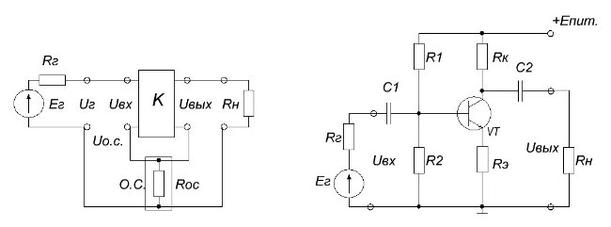 Коэффициенты усиления усилителя без обратной связи (К) и с обратной связью (Ко.с.) определяются соответственно: