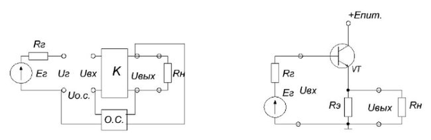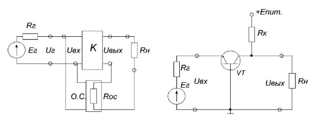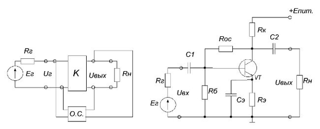 Рисунок 1.3-Структурная схема и пример соответствующей принципиальной схемы, содержащей последовательную обратную связь по напряжению.