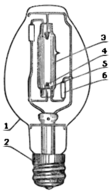 Четырёхэлектродная лампа ДРЛ состоит из внешней стеклянной колбы (1), снабжённой резьбовым цоколем (2). На ножке лампы смонтирована установленная на геометрической оси внешней колбы кварцевая горелка (разрядная трубка) (3), наполненная аргоном с добавкой ртути. Четырёхэлектродные лампы имеют основные электроды (4) и расположенные рядом с ними вспомогательные(зажигающие) электроды (5). Каждый зажигающий электрод соединён с находящимся в противоположном конце разрядной трубки основным электродом через токоограничвающее сопротивление (6). Вспомогательные электроды облегчают зажигание лампы и делают её работу в период пуска более стабильной.