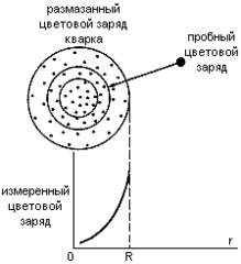 Аналогичную ситуацию можно ожидать и в кквантовой хромодинамике (КХД). Цветовой заряд кварка будет экранироваться. При экранировке цветового заряда кварка в хромодинамике вокруг цветного кварка образуется поле виртуальных глюонов и кварк - антикварковых пар (рис. 3). Однако в квантовой хромодинамике в распределении цветового поля имеются существенные отличия. Т.к. глюоны имеют цветовой заряд, они взаимодействуют не только с кварками, но и с друг другом, что существенно меняет распределение цветового заряда вокруг кварка. Цветной кварк оказывается окружен преимущественно зарядами того же цвета. Поэтому, например, при приближении пробного цветового заряда к красному кварку он проникает внутрь облака красного цвета и, следовательно, величина измеренного красного заряда уменьшается - наблюдается эффект антиэкранировки. Т.е. при уменьшении растояния между цветными кварками величина взаимодействия уменьшается. Это явление называется асимптотической свободой кварков в адроне на малых расстояниях. Зависимость константы сильного взаимодействия от расстояния показана на рис.4(**)
