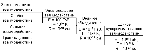Условия для объединения взаимодействий могли существовать в самом начале образования Вселенной, сразу после Большого взрыва. Реликтами эпохи Большого взрыва являются микроволновое излучение, отвечающее температуре 2.7 K, и, возможно, монополи Дирака - гипотетические магнитные заряды.