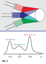На сегодняшний момент существует три способа получение белого света с помощью светодиодов: смешивание в определенной пропорции излучения красного, зеленого и синего светодиодов. При этом могут быть использованы как отдельные светодиоды разных цветов, так и 3-кристальные светодиоды, объединяющие кристаллы красного, синего и зеленого свечения в одном корпусе. На рис. 2 показано получение белого света путем смешивания в определенной пропорции излучения красного, зеленого и синего светодиодов.