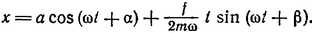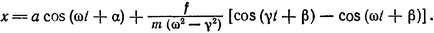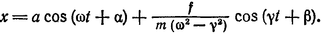 Частный интеграл уравнения (2,2) ищем в виде х1 = b cos (yt+β) с тем же периодическим множителем. Подстановка в уравнение дает: b=f/m(ω²-y²); прибавляя решение однородного уравнения, получим общий интеграл в виде