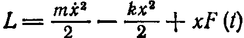 Первый член является функцией только от времени и потому может быть опущен в лагранжевой функции (как полная производная по t от некоторой другой функции времени). Во втором члене — dUe/dx есть внешняя «сила», действующая на систему в положении равновесия и являющаяся заданной функцией времени; обозначим ее как F(t). Таким образом, в потенциальной энергии появляется член — xF(t), так что функция Лагранжа системы будет: