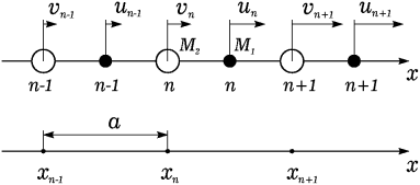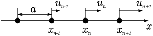 Рассмотрим одномерную периодическую цепочку атомов – одномерный кристалл с одним атомом в элементарной ячейке. Пусть период этой цепочки равен a. Тогда в состоянии равновесия координата n-го атома цепочки xn равна na.