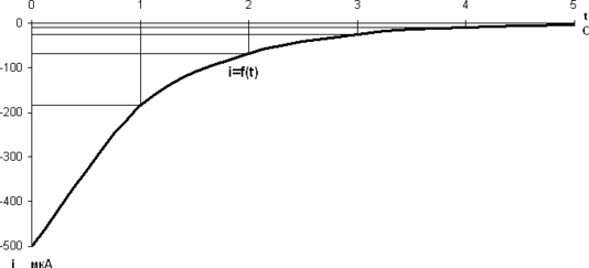 Аналогично вычисляем значения зарядного тока согласно закону изменения переходного тока при заряде конденсатора для значений времени t=0, τ, 2τ, 3τ, 4τ, 5τ.