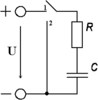 Цепь с последовательно включенными конденсатором емкостью С = 50 мкФ и сопротивлением R = 10 КОм подсоединяется к источнику постоянного напряжения U = 50 В (переключатель в положении 1). Определить законы изменения переходных напряжений и тока при заряде конденсатора и построить их графики. Затем цепь отключается от источника и одновременно переключатель переводится в положение 2. Определить законы изменения переходных напряжений и тока при разряде конденсатора и построить их графики. Определить фактическую длительность заряда и разряда конденсатора и энергию электрического поля при 1 = Зτ. Схема цепи приведена на рис.2.6