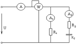 В сеть переменного тока с действующим значением напряжения U включена цепь, состоящая из двух параллельных ветвей. Определить показания приборов, реактивную мощность цепи, коэффициент мощности и построить векторную диаграмму напряжений. Указать на схеме положительное направление токов в ветвях и обозначить эти токи.