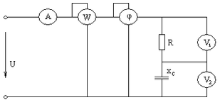 U = U m sin ωt промышленной частоты f = 50 Гц включены резистор и конденсатор. Определить показания приборов, реактивную и полную мощность цепи. Построить треугольник напряжений и векторную диаграмму напряжений.