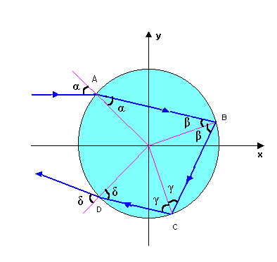 Можно рассмотреть простейший случай: пусть на капли, имеющих форму шара, падает пучок параллельных солнечных лучей. Луч, падающий на поверхность капли в точке А, преломляется внутри нее по закону преломления: n sin α=n sin β, где n=1, n≈1,33 – соответственно показатели преломления воздуха и воды, α – угол падения, а β – угол преломления света.