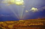 о мере того как Солнце опускается глубже под горизонт, возникает быстро расплывающееся розовое пятно - так называемый "пурпурный свет", достигающий наибольшего развития при глубине Солнца под горизонтом около 4-5o. Облака и вершины гор заливают алые и пурпурные тона, а если облака или высокие горы находятся за горизонтом, то их тени протягиваются около солнечной стороны неба и становятся насыщеннее. У самого горизонта небо густо краснеет, а по ярко окрашенному небу от горизонта к горизонту тянутся светлые лучи в виде отчетливых радиальных полос ("Лучи Будды"). Тем временем тень Земли быстро надвигается на небо, ее очертания становятся расплывчатыми, а розовое окаймление еле заметным.