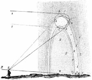 | Рисунок из работы Р. Декарта, поясняющий наблюдение радуги |
