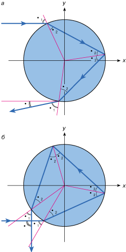 Ход лучей в капле воды: а - при одном отражении, б - при двух отражениях