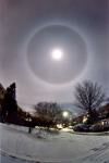 Иногда Солнце выглядит так, как будто его видно через большую линзу. На самом деле, на изображении виден эффект миллионов линз: ледяных кристаллов. По мере того как вода замерзает в верхних слоях атмосферы, могут образовываться маленькие, плоские, шестиугольные ледяные кристаллы льда. Плоскости этих кристаллов, которые кружась, постепенно опускаются на землю, большую часть времени ориентированы параллельно поверхности. На восходе или закате, луч зрения наблюдателя может проходить через эту самую плоскость, и каждый кристалл может вести как миниатюрная линза, преломляющая солнечный свет. Совместный эффект может приводить к появлению явления, называемого паргелия, или ложного солнца. В центре картинки видно Солнце и два хорошо заметных ложных солнца по краям. Позади домов и деревьев заметны гало ( гало - произносится с ударением на "о"), размером около 22 градуса, три солнечных колонны, и арку, созданные солнечным светом, отражаемый атмосферными ледяными кристаллами.