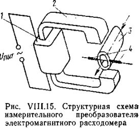 Измерительный преобразователь расхода электромагнитного расходомера (рис. VIII.15) состоит из немагнитного участка трубопровода 3 с токосъемными электродами 4 и ярма электромагнита 2 с обмоткой возбуждения 1, охватывающего трубопровод.