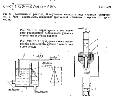 Эти расходомеры применяются для измерения расхода загрязненных жидкостей. Принцип действия приборов основан на зависимости уровня жидкости в сосуде от расхода при свободном истечении ее через калиброванное отверстие (щель) в дне или боковой стенке. Профиль и диаметр отверстия рассчитываются таким образом, чтобы указанная зависимость была линейной. Уравнение расхода через отверстие в дне или стенке сосуда в общем виде выражается следующей зависимостью: