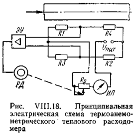 Чувствительными элементами термоанемометрического являются резисторы R1 и R2, помещаемые (наматываемые) на стенке трубопровода на некотором расстоянии друг от друга. Манганиновые резисторы R3 и R4 служат для создания мостовой схемы, питаемой от источника напряжения