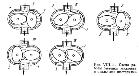 Овально-шестеренчатый счетчик жидкостей (рис. VIII.11) состоит из двух одинаковых овальных шестерен, вращающихся под действием перепада давления жидкости, протекающей через его корпус. В положении 1 правая шестерня отсекает некоторый объем жидкости 1, так как на эту шестерню действует крутящий момент, она поворачивается по часовой стрелке, вращая при этом левую шестерню против часовой стрелки. В положении 2 левая шестерня заканчивает отсекание новой порции жидкости, а правая выталкивает ранее отсеченный объем в выходной патрубок счетчика. В это время вращающий момент действует на обе шестерни. В положении 3 ведущей является левая шестерня, отсекающая заданный объем. В положении 4 правая шестерня заканчивает отсекание объема, а левая выталкивает объем. В положении 5 полностью отсекается заданный объем; обе шестерни сделали по пол-оборота, и ведущей стала опять правая шестерня. Вторая половина оборота шестерен протекает аналогично. Таким образом, за один полный оборот шестерен отсекается четыре дозирующих объема. Учет жидкости основан на отсчете числа оборотов шестерен.
