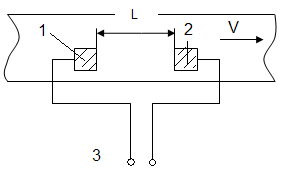 На поверхности трубопровода расположены два пьезоэлектрических элемента 1 и 2. Пьезоэлемент 1 механическим переключателем 3 подключен к генератору высокочастотных синусоидальных электрических колебаний. Пьезоэлемент преобразует электрические колебания в ультразвуковые, которые направляются в контролируемую среду через стенки трубопровода. Пьезоэлемент 2 воспринимает ультразвуковые колебания, прошедшие в жидкости расстояние L, и преобразует их в выходные электрические колебания.