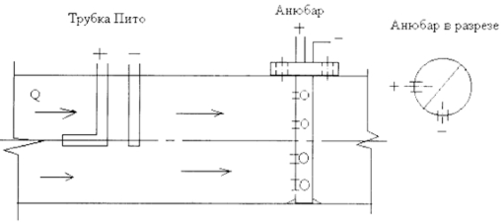 Чаще для измерения расхода используют анюбар, который обеспечивает усреднение динамического давления потока по всему сечению трубопровода. Анюбар состоит из 2-х секций в одном корпусе, расположенных под углом 90º друг к другу. Отверстия положительной секции ("+") расположены встречно потоку, а отрицательной ("-") – перпе-ндикулярно.