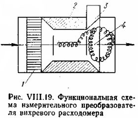 Измерительный преобразователь вихревого расходомера (рис. VIII.19) представляет собой завихритель 1, вмонтированный в трубопровод, с помощью которого поток, завихряется (закручивается) и поступает в патрубок 2. На выходе из патрубка в расширяющейся области 4 установлен пьезометрический преобразователь 3, воспринимающий и преобразующий вихревые колебания потока (для которых имеет силу зависимость: