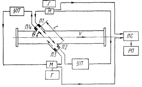 Соответственно время перемещения колебаний между пьезоэлементами ПЗ и П4 против направления потока