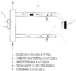 Среда, расход которой измеряется, поступает на вход преобразователя и изменяет направление движения по U-образной трубке. Среда проходит по одному колену трубки в прямом направлении, а по другому- в обратном. В середине U-образной трубке на её конце установлен электромагнит- вибровозбудитель, сообщающей трубке поперечное синусоидальное колебание. При этих условиях среда протекающая по трубке имеет поступательное и вращательное движение. Их совокупность вызывает появление ускорения и силы Кориолиса. За счёт разной направленности поступательного движения среды по коленам трубки сила Кориолиса в зоне перехода прямых участков трубки в дугообразные воздействует в противоположных направлениях и в зоне перехода на трубку действуют моменты сил, изгибающие трубку в вертикальной плоскости. Во входной половине трубки сила Кориолиса, действующая на трубку со стороны среды, расход которой измеряется, препятствует смещению трубки, а в выходной способствует смещению. В зонах перехода дугообразного участка трубки в прямолинейные участки установлены электромагнитные преобразователи результирующих колебаний трубки. Трубка колеблется в вертикальной плоскости с амплитудой пропорциональной массе среды протекающей через U-образную трубку. Электромагнитные преобразователи измеряют величину амплитуды колебаний и сдвиг фаз, который происходит за счёт отставания возникновения сил Кориолиса на сопряженных участках. Расход определяется путём измерения временной задержки между сигналами электромагнитных преобразователей, а плотность- измерением резонансной частоты колебаний (резонансная частота является функцией массы, а масса пропорциональна плотности). Термометр сопротивления на поверхности трубки учитывает изменение модуля упругости материала трубки.