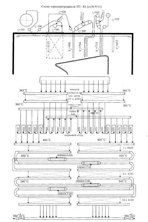 Пар из барабана поступает в потолочный пароперегреватель, экранирует потолок топки, горизонтального газохода, поворотной камеры, возвращается, делает большую петлю на входе в опускной газоход (эта петля является первой частью КПП 1) и поступает на вход в ширмовый пароперегреватель (- 2 ступень пароперегревателя) проходит противотоком средние ширмы и поступает в пароохладитель 1 ступени. Далее с перебросом слева на право пар противотоком проходит крайние ширмы и поступает во входные коллекторы пароперегревателя первой ступени - вторая часть КПП 1. После КПП 1 расположена вторая ступень впрыска. Опять, с перебросом слева на право пар поступает во входные коллекторы третьей ступени пароперегревателя, проходит его также прямотоком и поступает во входные коллекторы пароохладителя третьей, ступени, после чего пар подается на вход четвертой, последней ступени пароперегревателя, проходит ее прямотоком и подается в выходные коллекторы. Откуда пар по двенадцати трубам поступает в паросборную камеру с двумя противоположными выходами.