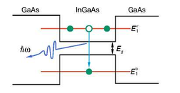 Для того чтобы квантовую яму превратить в лазер, нужно ее подсоединить к двум контактам, через которые электроны могут непрерывно поступать в рабочую область. Пусть через один контакт электроны поступают в зону проводимости. Далее, совершая скачки из зоны проводимости в валентную зону, они будут излучать кванты, то есть порции электромагнитного излучения (рис. 3). Затем через валентную зону носители тока должны уходить на другой контакт.