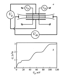 Одним из наиболее важных следствий получения одномерных баллистических каналов внутри гетероструктур GaAs-AGaAs и кремниевых сверхрешёток стало обнаружение квантования проводимости в зависимости от напряжения на затворе, управляющего шириной квантовой проволоки (рис. 4, а), которое проявляется в виде серии плато одномерной проводимости, разделенных ступенями величиной gsgve2/h; где gs и gv – спиновый и долинный факторы соответственно. Рост напряжения на затворе приводит к увеличению ширины квантовой проволоки, тем самым стимулируя заполнение большего числа подзон размерного квантования. При этом зависимость G(Vg) имеет ярко выраженный ступенчатый характер, так как кондактанс квантовой проволоки изменяется скачком каждый раз, когда уровень Ферми совпадает с одной из подзон размерного квантования:
