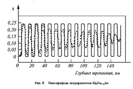 На рис. 8 представлен экспериментальный оже-профиль состава сверхрешеточной структуры [2,4], состоящей из чередующихся слоев GaAs и Al0,25Ga0,75As. Толщина каждого слоя составляла 5 нм. Точками на рисунке показаны экспериментальные значения величины x в формуле AlxGa1-xAs. Эти значения были вычислены из отношения интенсивностей оже-пиков Al (1390 эВ) и As (1228 эВ). Профиль концентрации Al получен последовательным стравливанием поверхностных слоев сверхрешеточной структуры ионами аргона с энергией 1,5 кэВ. Скорость травления составляла 0,3 – 1 нм/мин. Постепенное уменьшение амплитуды осцилляций величины x по мере травления связано с пространственным различием скоростей травления по площади сфокусированного первичного пучка электронов.