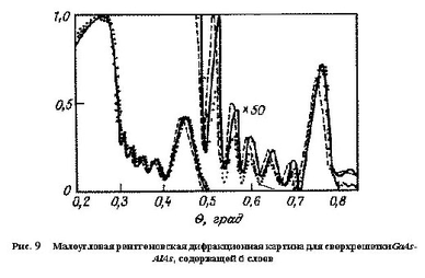 На рис. 9 представлена дифракционная картина в малоугловой области для сверхрешетки GaAs – AlAs, содержащей 6 периодов [2]. Точки на этом рисунке представляют экспериментальные результаты, сплошная кривая – результат теоретических расчетов для d = 12,72 нм. Экспериментальная и расчетная дифракционная картины согласуются не только по положению пиков, но и по интенсивности и ширине линий. Штриховая кривая соответствует теоретическим расчетам, при которых изменен период сверхрешетки всего на 0,28 нм, что соответствует изменению толщины всего на два атомных слоя. Отличие от экспериментальных результатов в этом случае существенно. Эти оценки свидетельствуют о возможности контроля этим методом совершенства границ и когерентности периодов с атомной точностью. В случае плавного изменения межплоскостного расстояния на границе между слоями сверхрешетки, кроме дополнительных рефлексов в малоугловой области наблюдаются сверхструктурные рефлексы (сателлитные отражения), сопровождающие основные рефлексы на рентгенограммах.