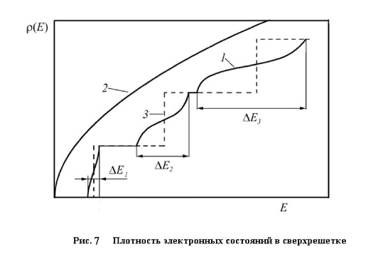 Плотность электронных состояний в полупроводниковой сверхрешетке существенно отличается от соответствующей величины в трехмерной электронной системе. На рис. 7. показана зависимость плотности электронных состояний