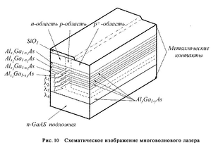 В качестве примера на рис. 10 показано схематическое изображение структуры многоволнового лазера [6]. В структуре имеется четыре активных слоя AlxGa1-xAs разного состава (x = x1, x2, x3, x4), благодаря которым лазер одновременно работает на четырех длинах волн