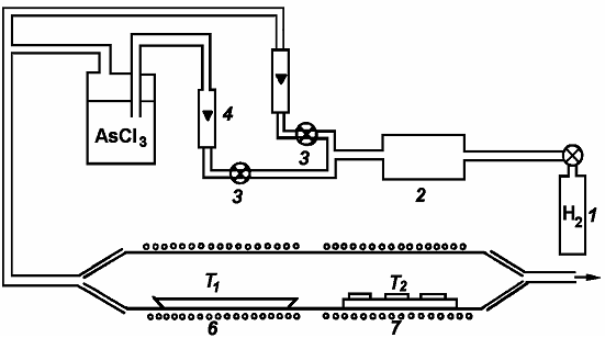 Процесс проводится с помощью установки, изображенной на рис.2.4 Исходный галлий 6 и подложки 7 помещаются в кварцевую трубу, которая расположена в двузонной печи сопротивления. В кварцевый реактор подается смесь водорода и паров AsCl3. Для дозировки соотношения AsCl3/H2 поток водорода разделяется на две нити; по одной дозированное количество водорода подается непосредственно в реактор, а по другой сначала проходит через питатель, содержащий AsCl3, насыщается парами AsCl3, а затем смешивается с основным потоком водорода. Парогазовая смесь, попадая в реактор, нагретый до температуры Т1, подвергается реакции