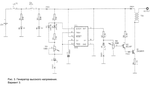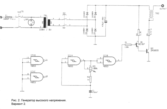 представляет собой почти туже схему, что и рисунок 1 - их левые части равны до конденсатора С2. В остальной части вместо колебательного контура применяется автоколебательный мультивибратор. При чём C1 заряжается через R2 и R3 до тех пор, пока напряжение на С1, идущее от IC1A, не достигнет высшей границы. Затем С1 разряжается до нижней границы. Затем процесс повторяется снова и т.д. IC1B включён как возбудитель. При этом оставшиеся IC1C и IC1D не весят просто в воздухе, а заземлены. Q1 и Q2 образуют вместе с оставшимися сопротивлениями двухступенчатый выход, который подаётся на катушку зажигания TR2 от автоколебательного мультивибратора в режиме посылаемых сигналов. На выходе "output" получаем искомое напряжение.