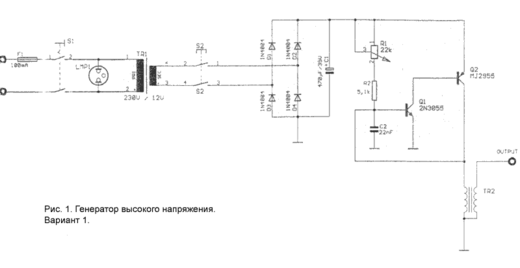 Рисунок № 1 показывает схему простого высокочастотного генератора высокого напряжения, который можно собрать на обыкновенной плате. Эта схема питается от напряжения 230 Вольт. S1 - основной выключатель, который соединяет сеть с прибором. Трансформатор выдаёт переменное напряжение 12 Вольт. Кнопка S2 включает прибор в рабочий ток. Затем идёт выпрямление тока при помощи диодов D1-D4 и конденсатора C1. Конденсатор C2, сопротивления R1 и R2, трансформатор TR2 создают колебательный контур, частота в котором регулируется при помощи потенциометра R1. Транзисторы Q1 и Q2 способствуют тому, чтобы колебания были незатухающими. Во время работы они могут сильно нагреваться, поэтому необходимо снабдить их охладителями. TR2 представляет собой обыкновенную катушку зажигания, которая используется в автомобильных моторах. На выходе "output" получаем высокочастотный ток высокого напряжения. Длительность импульса на выходе регулируется вручную, т.е. временем нажатия кнопки S2. Лампочка LMP1 сигнализирует о готовности генератора к работе.