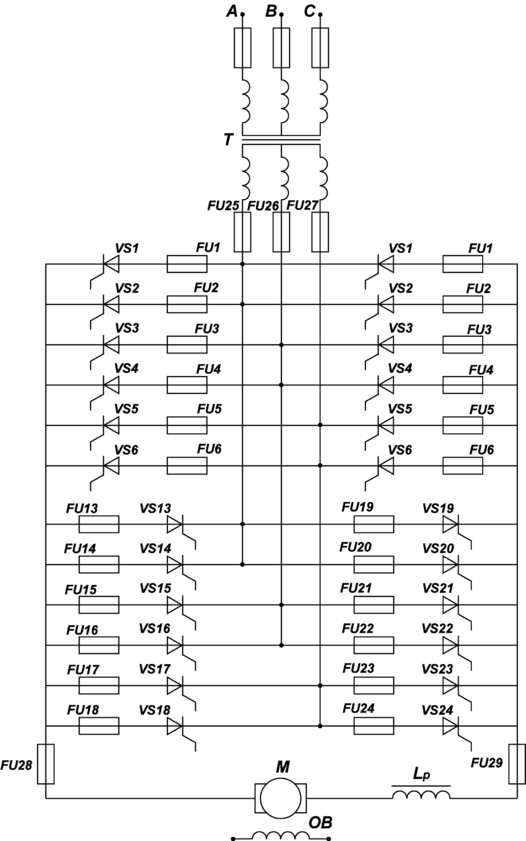 Оба условия выполняются с большим запасом (4000 А > 2200 А; 87000 А2.с > 2700 А2.с), следовательно, при выходе из строя одного из тиристоров предохранитель обеспечивает защиту остальных. Применение параллельного соединения двух тиристоров обосновано, так как иначе условия (38) и (39) не были бы выполнены.