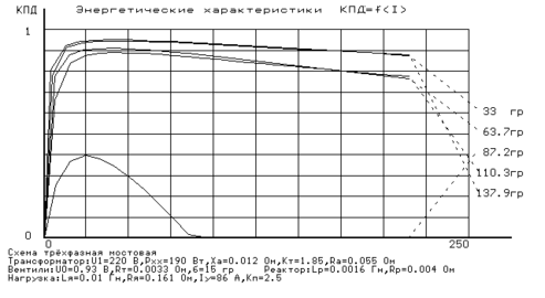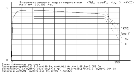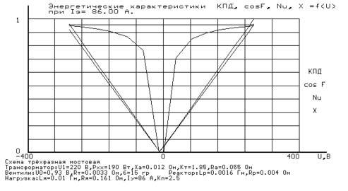Ограничительная характеристика (рис. 5, 6) также, как и внешние, построена для одного комплекта двухкомплектного преобразователя (комплекта «Вперёд»). Она представляет собой прямую и ограничивает область устойчивой работы преобразователя. Энергетические характеристики для КПД, коэффициента мощности χ, коэффициента несинусоидальности тока υ, cos(φ) в функции тока построены на общем графике для угла α (рис. 10), соответствующего номинальному напряжению на двигателе при токе IУ. Энергетические характеристики для этих же показателей в функции напряжения строятся при постоянном токе IУ.Из графика зависимости η = f(I) при разных углах управления (рис. 9) видно, что при угле управления α = 87,4 град. эл. и токе I=Iу=68 А КПД спадает до нуля, так как при этих условиях напряжение на двигателе равно нулю, то есть полезная мощность равна нулю. При токе I > Iу КПД остается равной нулю, так как потребляемая мощность положительная, а напряжение на двигателе отрицательное. При углах управления α = 33 град. эл. и α = 137,9 град. эл., обеспечивающих напряжение ±220 В, графики КПД в инверторном и выпрямительном режимах совпадают. Аналогично, практически совпадают графики КПД при углах управления α = 63,7 град. эл. и α = 110,3 град. эл., но проходят ниже предыдущих. Кроме того, графики КПД в некоторой точке достигает максимального значения, а затем несколько спадают.Из графиков зависимостей υ = f(I), χ = f(I), cos φ = f(I) видно, что с увеличением тока значения функций χ = f(I) и cos φ = f(I) уменьшаются, а υ = f(I) увеличиваются. При I = const и увеличения модуля напряжения cos φ и χ возрастают, а υ не изменяется.