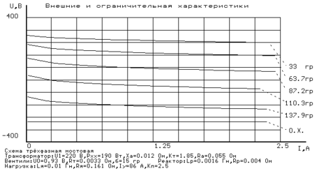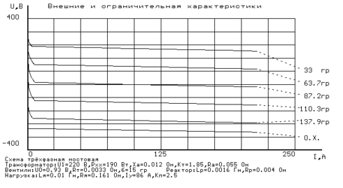 На основе математического описания [1] разработана программа расчёта внешних, регулировочных, энергетических и ограничительных характеристик преобразователя, с помощью которой построены характеристики на ЭЦВМ. Также строятся внешняя и ограничительная характеристики, рассчитанные приближенным методом при пренебрежении активными сопротивлениями. Для напряжения UЗ, равного 220 В, расчетом с помощью ЭЦВМ определен угол α = 40 град. эл. Для этого угла произведен расчёт.
