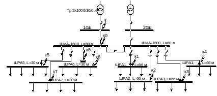 По расчетной схеме составляется схема замещения, в которой указываются сопротивления всех элементов и намечаются точки КЗ.