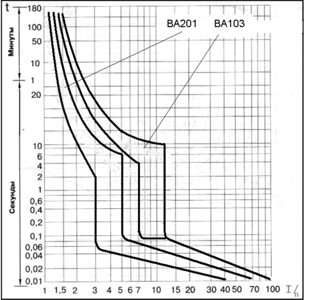 Рис. 3 Амперсекундные характеристики выключателей серии ВА-201 и ВА103