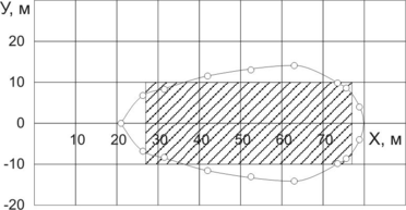 По рассчитанным значениям x и у строим кривую изолюкс (рис.1.3.2). На рисунке наносим контуры хозяйственного двора так, чтобы его территория как можно больше оказалась накрытой кривой изолюкс. Из рисунка видно, что опора прожектора должна быть установлена на расстоянии 27м от малой стороны контура двора.
