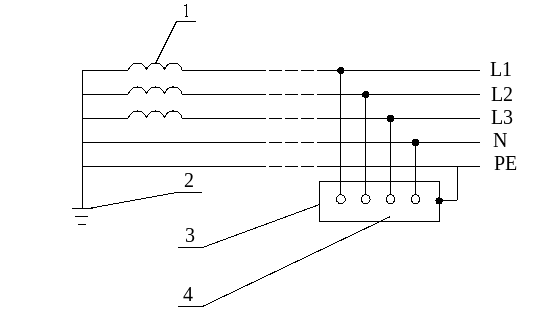В курсовом проекте принята система типа TN-S согласно ГОСТ-30.331. Данная система предусматривает то, что нейтраль источника питания (трансформатора) глухо заземлена, а открытые проводящие части электроустановок присоединены к глухозаземленной нейтрали посредством нулевых защитный проводников (РЕ). На рисунке показана схема подключения электроприемника по системе TN-S заземления.
