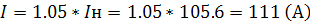 Ток в линии с учётом 5% от мощности нагревателя на местное освещение и питание схемы управления.