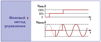 При фазовом методе в зависимости от требуемой величины потребляемой мощности меняется угол открытия тиристора или симистора, что обеспечивается системой импульсно-фазового управления (СИФУ). Фазовый метод используется для управления малоинерционными потребителями, быстро реагирующими на напряжение, а так же при управлении освещением – это его достоинства. Однако такой метод не может защитить питающую сеть от помех, высших гармоник и дополнительно загружает её реактивной мощностью, так как переключение силовых полупроводниковых элементов происходит не при нулевом значении сетевого напряжения – это недостаток фазового метода.