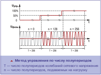 Метод управления по числу полупериодов позволяет значительно уменьшить уровень помех в электросети за счёт включения и отключения нагрузки в момент перехода сетевого напряжения через нуль – это его преимущество. То есть какое-то количество периодов промышленной частоты прибор находится под питанием, а какое-то отключен от сети. Поэтому этот метод регулирования мощности применяется только для инерционных нагрузок – это его недостаток.