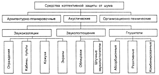 Классификация средств коллективной защиты от шума представлена на рис. 4.4. Акустические в свою очередь подразделяются на средства звукоизоляции, звукопоглощения и глушители.